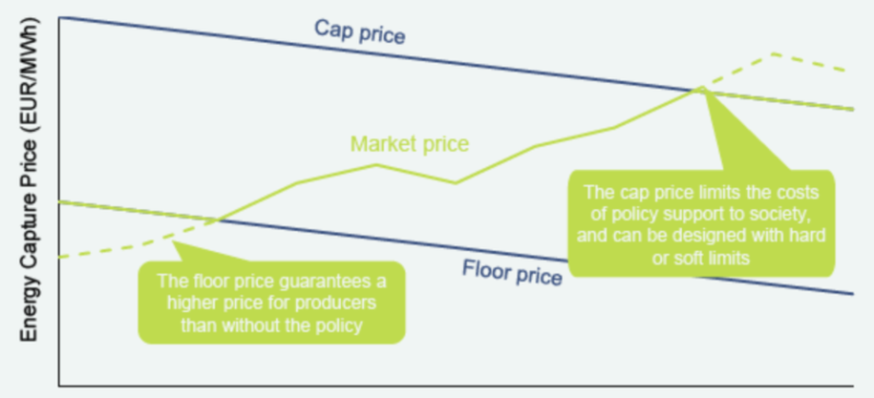 多年期合同為資產(chǎn)所有者定義了最低(“下限”)和最高(“上限”)水平的能源獲取價(jià)格(例如歐元/MWh)。如果資產(chǎn)捕獲的能源價(jià)格低于下限,則資產(chǎn)將獲得下限價(jià)格。類似的動(dòng)態(tài)適用于上限,但與其相反,“硬”上限表示可以獲得的最高的能源價(jià)格,以保護(hù)承購實(shí)體降低成本風(fēng)險(xiǎn)(超額收入返還給承購實(shí)體)。這些上限的目的是限制政策支持過程中的社會(huì)風(fēng)險(xiǎn)。與差價(jià)合約(CfD)一樣,上限和下限通常由政府機(jī)構(gòu)管理和資助,并由對(duì)電力消耗征收的稅費(fèi)提供支持。如果實(shí)施“軟”上限,則超過上限的部分捕獲價(jià)值可以與資產(chǎn)共享(例如隨著能源價(jià)格上漲超過上限,以預(yù)先設(shè)定的遞減部分),以有效地傳遞價(jià)格信號(hào)并獎(jiǎng)勵(lì)資產(chǎn)在系統(tǒng)最需要的時(shí)候參與。