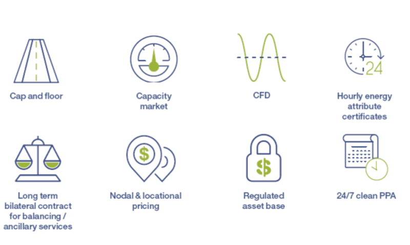 通常也稱為“定型購電協(xié)議”、“可調(diào)度”或“全天候”購電協(xié)議,這些是多年期合同,定義了可再生能源和柔性系統(tǒng)“混合”安裝的能源承購價(jià)格?!叭旌颉毙g(shù)語是指資產(chǎn)向負(fù)荷提供與時(shí)間匹配的清潔電力的能力。清潔能源電力采購協(xié)議有多種,這取決于消耗量與發(fā)電量的匹配程度(例如,80%的小時(shí)數(shù)與90%或100%的小時(shí)數(shù))。此類協(xié)議可通過公開招標(biāo)或雙邊合同授予,也可適用于獨(dú)立部署的儲(chǔ)能系統(tǒng)。該工具提供了定價(jià)提升潛力和長(zhǎng)期收入確定性。為了使全天候清潔能源電力采購協(xié)議鼓勵(lì)部署長(zhǎng)時(shí)儲(chǔ)能(LDES)等使能脫碳技術(shù),需要定義行業(yè)商定的質(zhì)量標(biāo)準(zhǔn)。