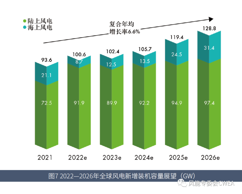 具體來(lái)說(shuō),2022―2026年全球陸上風(fēng)電有望新增裝機(jī)466GW,年均新增93.3GW,復(fù)合年均增長(zhǎng)率將達(dá)到6.1%。