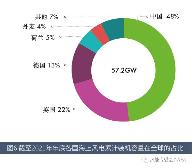 圖6 截至2021年年底各國(guó)海上風(fēng)電累計(jì)裝機(jī)容量在全球的占比