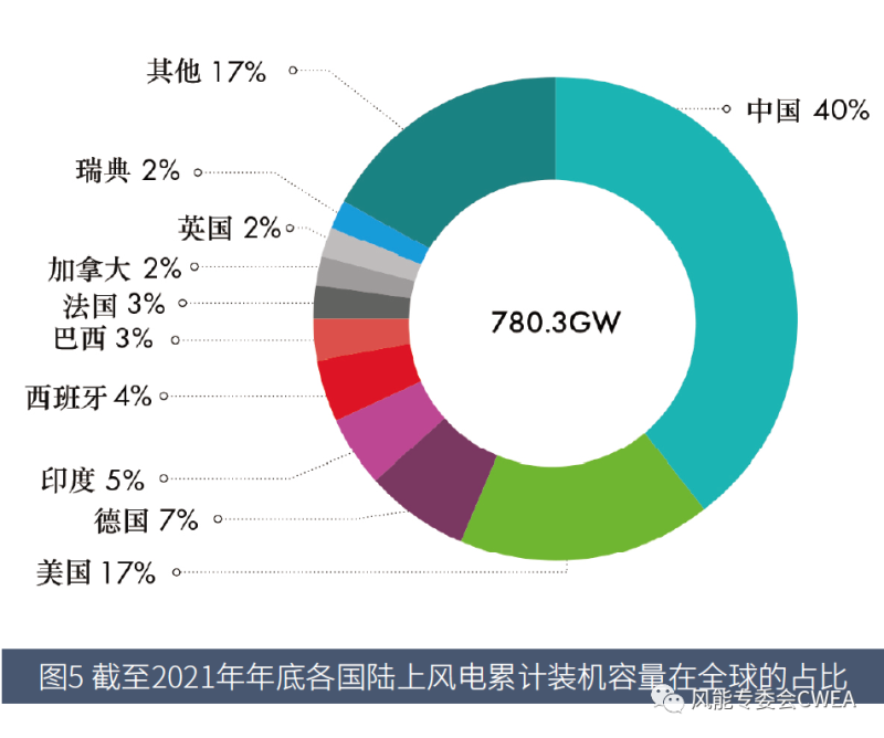 圖5 截至2021年年底各國(guó)陸上風(fēng)電累計(jì)裝機(jī)容量在全球的占比