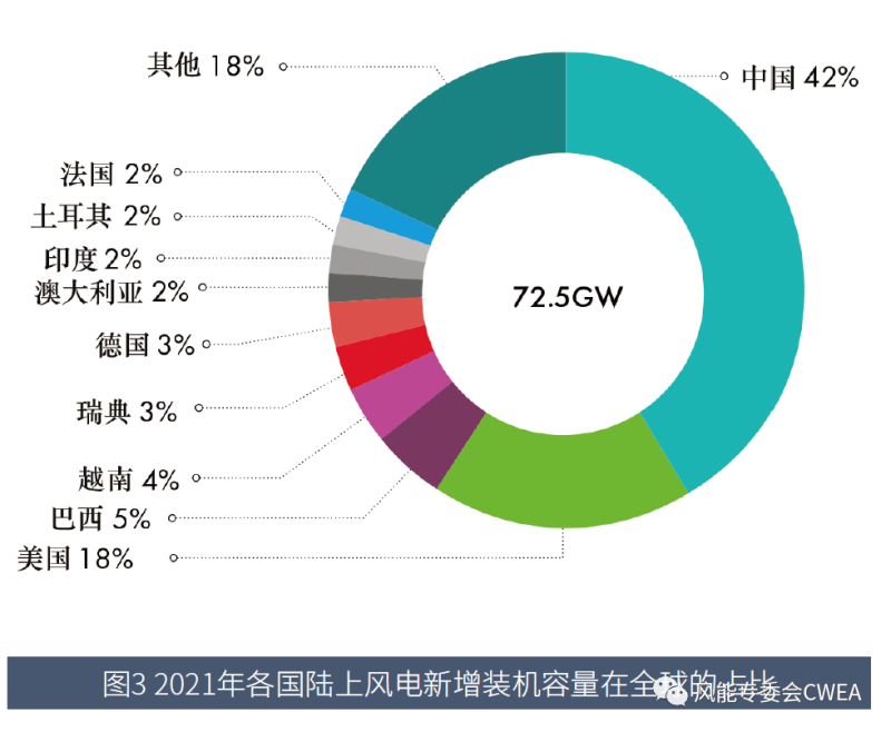 圖3 2021年各國(guó)陸上風(fēng)電新增裝機(jī)容量在全球的占比