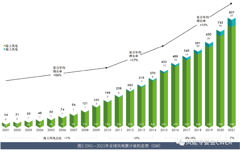 圖2 2001—2021年全球風(fēng)電累計(jì)裝機(jī)走勢(shì)(GW)