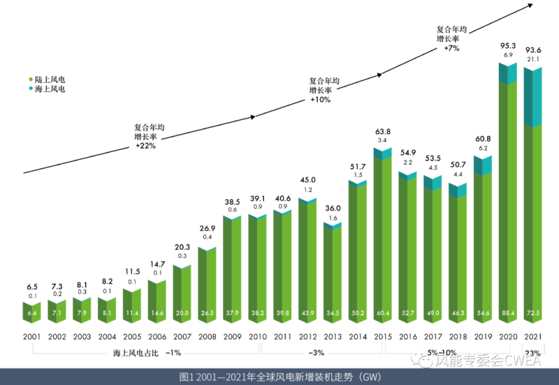 雖然2021年全球陸上風(fēng)電市場(chǎng)發(fā)展勢(shì)頭有所減弱,但72.5GW的新增裝機(jī)容量仍為歷史第二高水平。全年海上風(fēng)電新增裝機(jī)容量超過(guò)21GW,是上一年的3倍多,創(chuàng)下歷史新高。