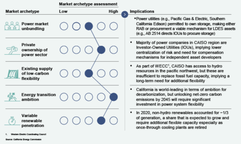 加利福尼亞州:受監(jiān)管資產(chǎn)基礎(chǔ)(RAB)垂直整合公用事業(yè)的自然投資途徑、雄心勃勃的脫碳目標(biāo)和現(xiàn)有的可再生能源顯著滲透意味著需要明確的長期靈活性目標(biāo)。