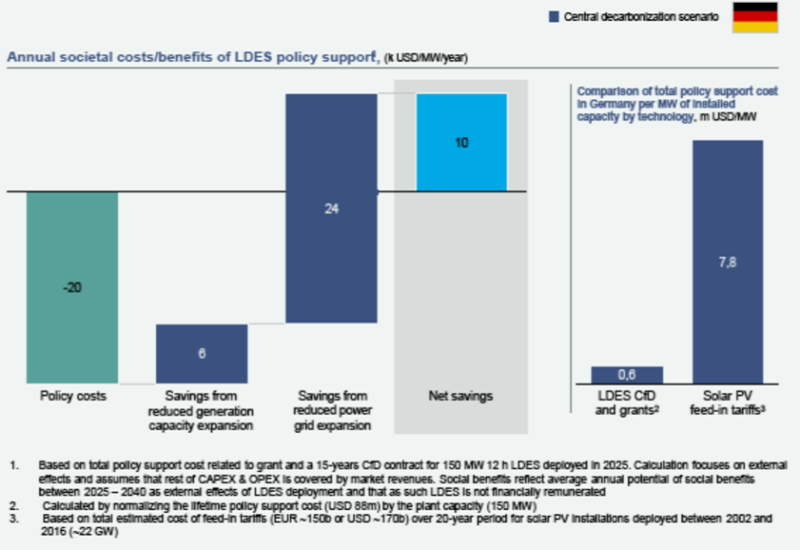 使用長時儲能(LDES)委員會在2021年凈零電力報告中計算的數(shù)據(jù),考慮到政策支持的成本并將其與電網(wǎng)(即輸配電)和發(fā)電容量的成本節(jié)省進(jìn)行比較,對凈社會價值創(chuàng)造進(jìn)行了估算。在每兆瓦容量的基礎(chǔ)上,將長時儲能(LDES)到2040年為德國創(chuàng)造的價值進(jìn)行標(biāo)準(zhǔn)化和年度化,其結(jié)果是創(chuàng)造了每年約3萬美元/ MW的價值,而在德國的例子中,說明性的支持成本約為每年2萬美元/MW。其凈社會效益如圖13所示,該圖還將德國太陽能上網(wǎng)電價的每兆瓦成本估算與向長時儲能(LDES)提供的說明性支持并列。