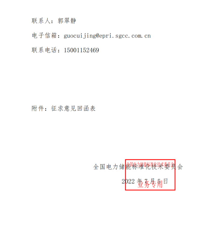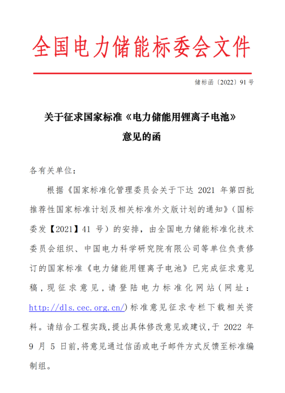 關(guān)于征求國(guó)家標(biāo)準(zhǔn)《電力儲(chǔ)能用鋰離子電池》意見的函