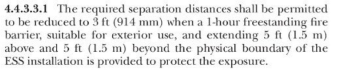需要說明的是,當(dāng)不滿足相關(guān)防火距離要求時,一般可通過設(shè)置防火墻進行隔離。例如電池艙之間不滿足3m的要求時,可設(shè)置防火墻,防火隔墻的超過外輪廓投影范圍外側(cè)各1m。對比NFPA855第4.4.3.3.1條的要求,防火隔墻需超過兩側(cè)和高度各1.5m。