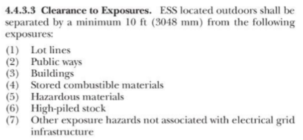 參照美國國家標(biāo)準NFPA855防火距離相關(guān)要求,電池艙距建筑物、易燃性材料等距離為3.048m,遠小于國內(nèi)標(biāo)準要求。