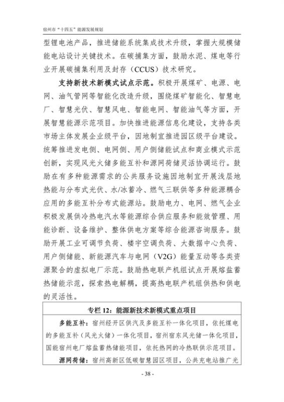 另外,《規(guī)劃》提出加快能源關(guān)鍵技術(shù)攻關(guān)和示范,支持新技術(shù)新模式試點(diǎn)示范。在儲能方面,依托宿州市全市儲能產(chǎn)業(yè)和儲能項(xiàng)目,開發(fā)新型鋰電池產(chǎn)品,推進(jìn)儲能系統(tǒng)集成技術(shù)升級,掌握大規(guī)模儲能電站設(shè)計關(guān)鍵技術(shù),統(tǒng)籌推進(jìn)發(fā)電側(cè)、電網(wǎng)側(cè)、用戶側(cè)儲能試點(diǎn)和商業(yè)模式示范創(chuàng)新,實(shí)現(xiàn)風(fēng)光火儲多能互補(bǔ)和源網(wǎng)荷儲靈活協(xié)調(diào)運(yùn)行。