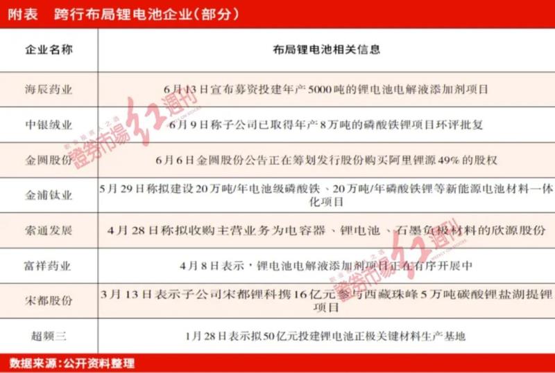 《紅周刊》注意到,今年以來,除海辰藥業(yè)、金圓股份,包括索通發(fā)展、金浦鈦業(yè)、宋都股份等多家公司通過收購、新建項目等形式向鋰電池領(lǐng)域布局。如索通發(fā)展4月28日稱,擬收購主營業(yè)務(wù)為電容器、鋰電池、石墨負(fù)極材料的欣源股份;金浦鈦業(yè)5月29日公告稱,擬建設(shè)20萬噸/年電池級磷酸鐵、20萬噸/年磷酸鐵鋰等新能源電池材料一體化項目。此外,宋都股份等企業(yè)也于近期發(fā)布了相關(guān)布局鋰電池的相關(guān)公告(附表)。據(jù)不完全統(tǒng)計顯示,今年以來,至少有數(shù)十家公司公告跨界鋰電池產(chǎn)業(yè)鏈的相關(guān)進(jìn)展。