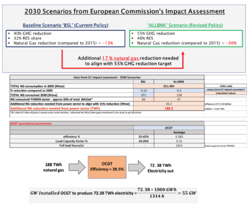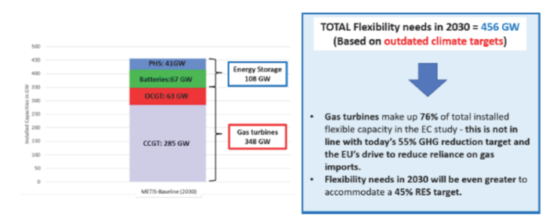 歐盟的影響評估研究表明,要實現(xiàn)情景中修訂后的減少55%溫室氣體的目標,需要將天然氣總發(fā)電量減少30%(與2015年相比)。這意味著到2030年,與基本情景相比,需要將天然氣發(fā)電用量再減少17%,才能實現(xiàn)減少55%的溫室氣體的目標。如上所述,歐盟對2020年儲能的研究基于過時的目標,因此認為到2030年仍有不成比例的天然氣發(fā)電廠提供靈活性。