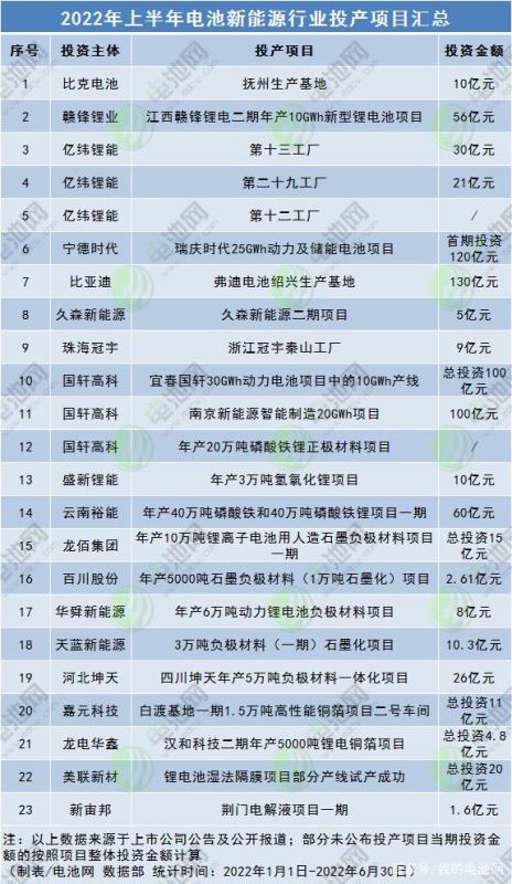 同時(shí),2022年上半年,統(tǒng)計(jì)在內(nèi)的23個(gè)電池新能源行業(yè)投產(chǎn)項(xiàng)目,21個(gè)公布投資金額,共計(jì)投資約750.31億元,平均每個(gè)項(xiàng)目投資約35.73億元。其中,鋰電池項(xiàng)目11個(gè),10個(gè)公布投資金額,共計(jì)581億元,平均投資58.1億元。(部分未公布當(dāng)期開(kāi)工投產(chǎn)項(xiàng)目金額的,按照項(xiàng)目整體投資金額計(jì)算)