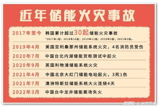 2019年4月,美國亞利桑那州儲能火災,造成四名消防員受傷;2021年北京大紅門儲能電站起火爆炸,一名值班電工遇難、二名消防員死亡、一名消防員受傷;2021年7月底,在澳大利亞維多利亞州世界上最大的電池基地之一的特斯拉Megapack儲能系統(tǒng)發(fā)生爆燃,延燒了四天;今年3月底,中國臺灣龍井儲能案場也發(fā)生失火意外……