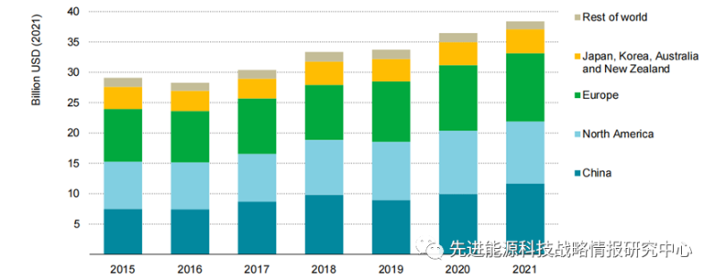 圖7 2015-2021年各國政府能源研發(fā)公共投入變化(單位:十億美元)