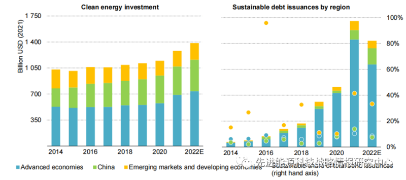 圖6 2014-2022年不同經濟體清潔能源投資規(guī)模與可持續(xù)債務變化趨勢(單位:十億美元)
