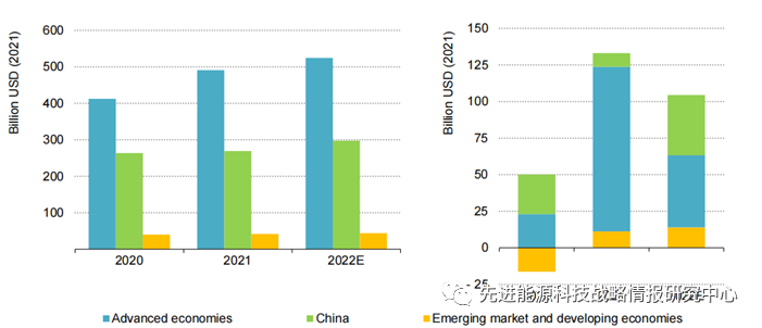 圖3 2020-2022年不同經濟體清潔能源投資總額變化趨勢(單位:十億美元)