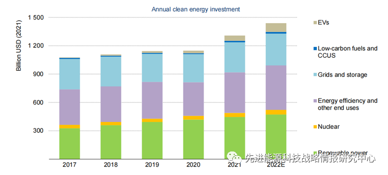 圖2 2017-2022年世界清潔能源投資總額變化趨勢(單位:十億美元)