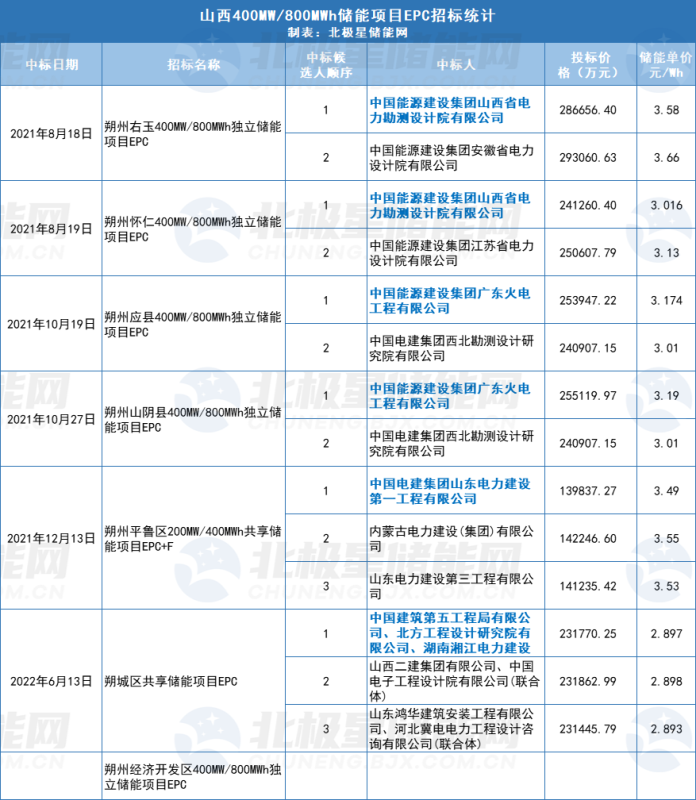 從前幾個(gè)大規(guī)模儲(chǔ)能項(xiàng)目開(kāi)標(biāo)情況來(lái)看,中國(guó)能建、中國(guó)電建下屬幾個(gè)單位包攬了這些項(xiàng)目,中標(biāo)均價(jià)約3.21元/Wh。此次新招標(biāo)的朔州經(jīng)開(kāi)區(qū)儲(chǔ)能項(xiàng)目不知又將花落誰(shuí)家?