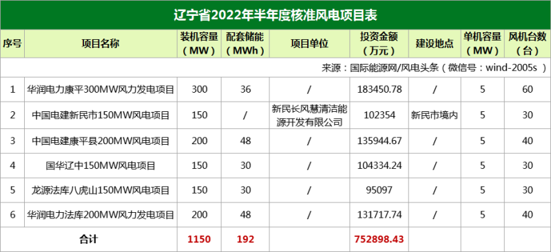 遼寧核準(zhǔn)6個(gè)風(fēng)電項(xiàng)目,總規(guī)模1150MW,配套儲(chǔ)能192MWh,總投資752898.43萬(wàn)元。