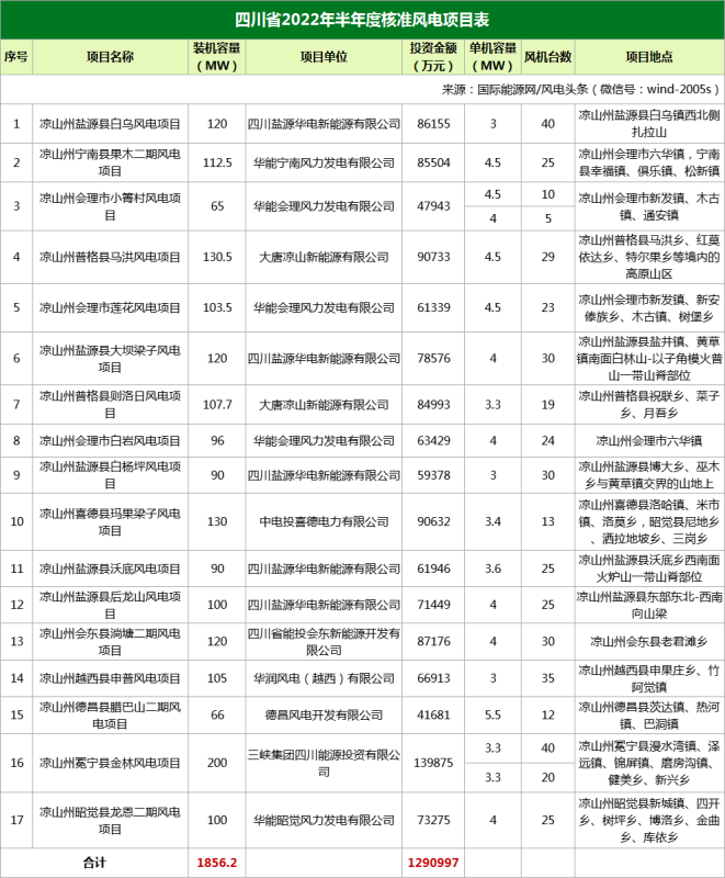四川核準(zhǔn)17個(gè)風(fēng)電項(xiàng)目,總規(guī)模1856.2MW,總投資1290997萬(wàn)元。