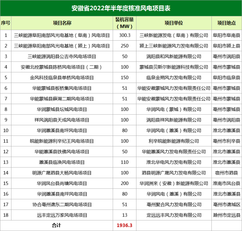 安徽核準(zhǔn)18個(gè)風(fēng)電項(xiàng)目,總規(guī)模1936.3MW。