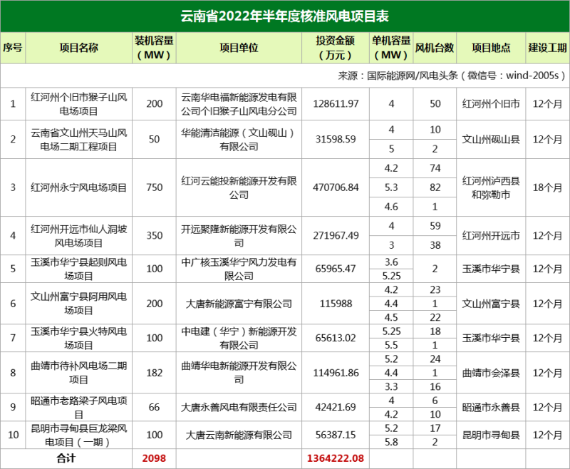 云南核準(zhǔn)10個(gè)風(fēng)電項(xiàng)目,總規(guī)模2098MW,總投資1364222.08萬(wàn)元。