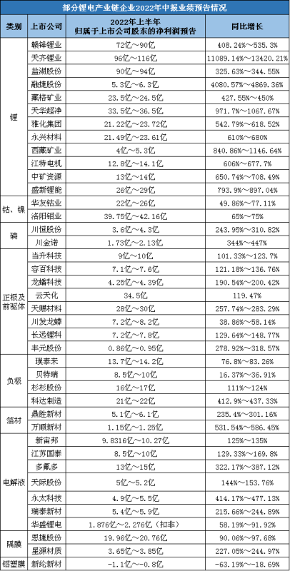 通過觀察鋰電池產(chǎn)業(yè)鏈部分上市企業(yè)上半年業(yè)績預(yù)告情況,可一窺市場些許動向。