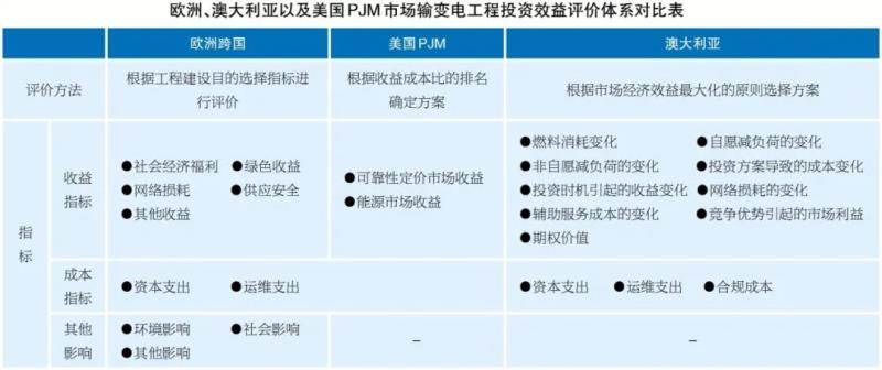 通過對(duì)國(guó)際實(shí)踐進(jìn)行梳理總結(jié),歐洲、澳大利亞以及美國(guó)PJM市場(chǎng)的輸變電工程投資效益評(píng)價(jià)方法和評(píng)價(jià)指標(biāo)體系如下表所示: