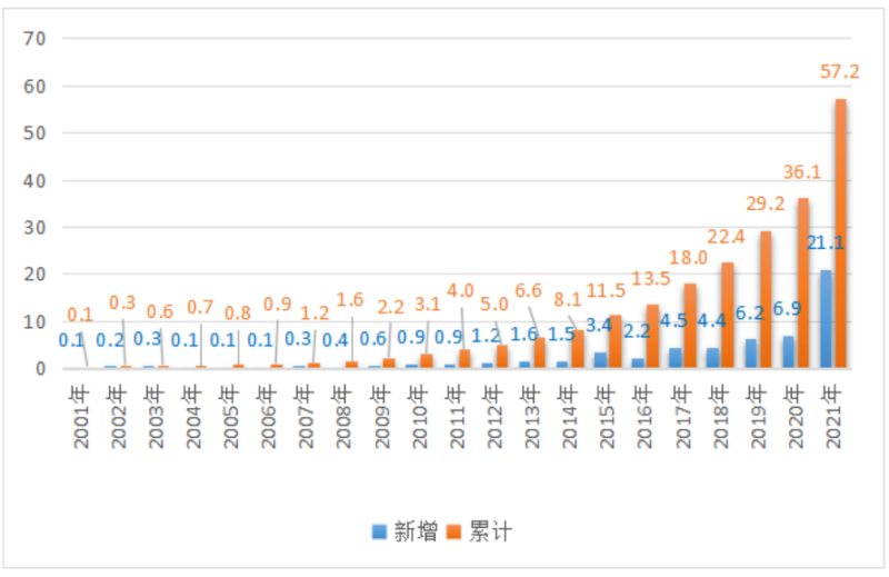 截至2021年底,全球海上風電累計裝機容量為57.2吉瓦,同比增長近60%,其中中國占48%,英國占22%,德國占13%。從新增裝機容量看,2021年呈爆發(fā)式增長,全球海上風電新增裝機容量21.1吉瓦,占全球新增總裝機容量的比重為22.5%;2021年新增海上風電裝機中中國占80%,英國占11%,越南占4%。(見圖1)