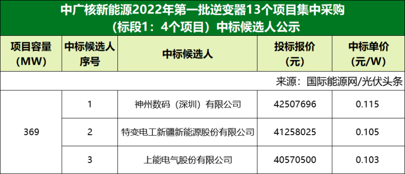 標段1第一中標候選人為神州數(shù)碼(深圳)有限公司,投標報價為42507696元,中標單價為0.115元/W;第二中標候選人為特變電工新疆新能源股份有限公司,投標報價為41258025元,中標單價為0.105元/W;第三中標候選人為上能電氣股份有限公司,投標報價為40570500元,中標單價為0.103元/W。