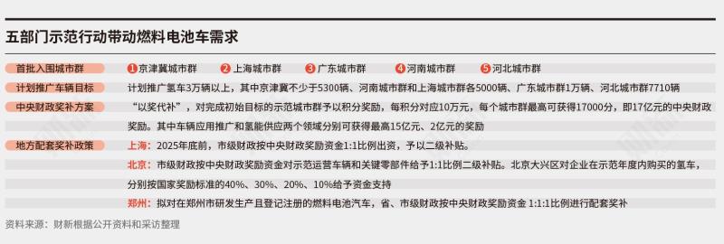 2020年9月,財政部等五部門發(fā)起燃料電池示范應(yīng)用行動(下稱“五部門示范行動”),京津冀、上海、廣東、河南、河北等五個城市群入圍首批試點,主要完成擴(kuò)大車輛規(guī)模、攻克燃料電池核心技術(shù)、提升全產(chǎn)業(yè)鏈經(jīng)濟(jì)性、完善相關(guān)政策法規(guī)等任務(wù)。對于完成初始目標(biāo)的示范城市群,中央財政予以事后獎勵,每個城市群最多可獲得17億元的財政獎勵。