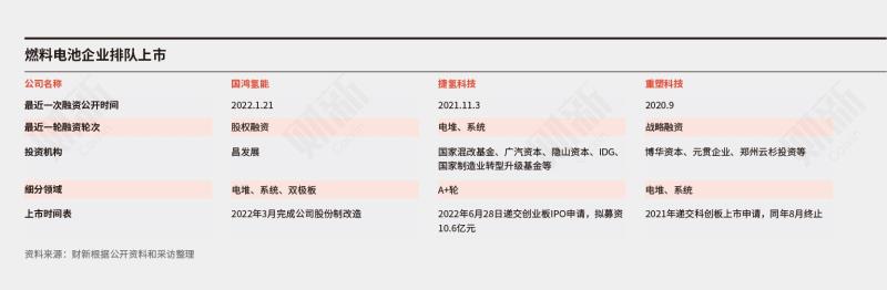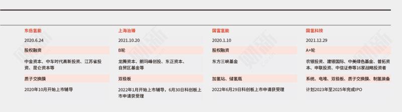 捷氫科技并非特例。目前,重塑科技、東岳氫能、國富氫能、上海治臻、國鴻氫能等氫能源電池廠商都完成了數(shù)輪融資,明確提出了上市計劃,各家背后都有不同城市集群的政策扶持以及數(shù)十家各類投資機(jī)構(gòu)。