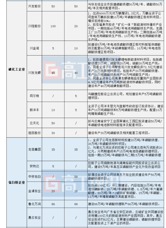 從擴(kuò)產(chǎn)主體來(lái)看,主要分為五股勢(shì)力:一是以湖南裕能、湖北萬(wàn)潤(rùn)為代表的傳統(tǒng)磷酸鐵鋰正極材料企業(yè);二是以格林美、中偉股份為代表的三元材料企業(yè);三是以龍佰集團(tuán)、川發(fā)龍蟒、金浦鈦業(yè)為代表的磷化工以及鈦白粉企業(yè);四是以鞍重股份為代表的跨界企業(yè);五是以國(guó)軒高科、科力遠(yuǎn)為代表的電池企業(yè)。