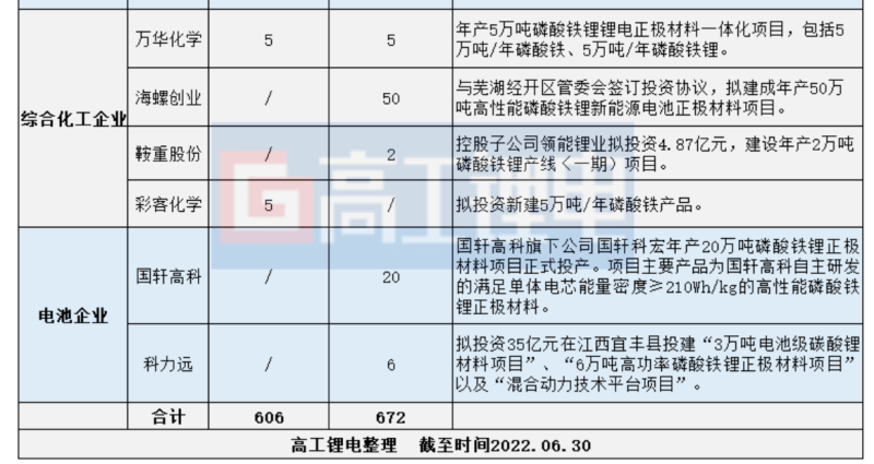 高工鋰電注意到,在磷酸鐵鋰供不應(yīng)求市場(chǎng)刺激下,老企業(yè)繼續(xù)擴(kuò)充產(chǎn)能,新玩家也紛紛跨界試水。據(jù)不完全統(tǒng)計(jì),2022年1-6月,國(guó)內(nèi)涉及磷酸鐵及磷酸鐵鋰的項(xiàng)目高達(dá)47項(xiàng),涉及磷酸鐵產(chǎn)能606萬(wàn)噸,磷酸鐵鋰產(chǎn)能672萬(wàn)噸。