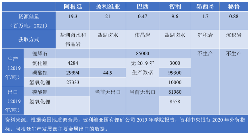 表1 拉丁美洲鋰資源儲(chǔ)量、生產(chǎn)和出口
