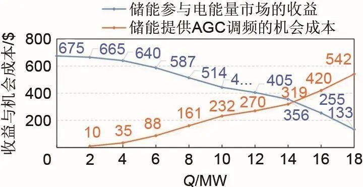 逐步模擬鋰電池儲(chǔ)能系統(tǒng)提供不同AGC調(diào)頻容量,其在電能量市場(chǎng)中的獲利情況,并獲取余下容量在能量市場(chǎng)中收益情況,并與全容量參與電能量市場(chǎng)時(shí)的收益對(duì)比,獲取儲(chǔ)能系統(tǒng)提供AGC調(diào)頻的機(jī)會(huì)成本。
