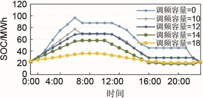 鋰電池儲(chǔ)能系統(tǒng)提供不同AGC調(diào)頻容量時(shí),其荷電狀態(tài)變化趨勢(shì)如圖5所示。儲(chǔ)能系統(tǒng)通過充放電參與電能量市場(chǎng),獲取收益。因此,荷電狀態(tài)的變化程度也可反映其在電能量市場(chǎng)中的收益情況。調(diào)頻容量為0,即儲(chǔ)能系統(tǒng)只參與電能量市場(chǎng)時(shí),儲(chǔ)能系統(tǒng)在電能量市場(chǎng)收益最大,最大荷電狀態(tài)接近100 MWh,最小值接近22 MWh;而當(dāng)調(diào)頻容量增大到10 MW時(shí),儲(chǔ)能系統(tǒng)最多儲(chǔ)存的電量不到80 MWh;當(dāng)調(diào)頻容量增大到12 MW時(shí),儲(chǔ)能系統(tǒng)最多儲(chǔ)存的電量不到70 MWh,儲(chǔ)能系統(tǒng)在電能量市場(chǎng)中的利用情況進(jìn)一步降低;當(dāng)調(diào)頻容量增大到18 MW時(shí),儲(chǔ)能系統(tǒng)的荷電狀態(tài)變化范圍為20~40 MWh,在電能量市場(chǎng)中的收益變得更小。當(dāng)系統(tǒng)儲(chǔ)能提供AGC容量較大時(shí),儲(chǔ)能系統(tǒng)的荷電狀態(tài)離上限范圍較大,即為松弛約束。然而,功率容量是限制儲(chǔ)能系統(tǒng)提供AGC獲利的主要因素。