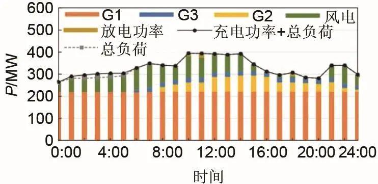 圖4中,三個(gè)常規(guī)機(jī)組總出力是6106.89 MWh,風(fēng)電出力是1471.2 MWh,儲(chǔ)能總充電功率為68.82 MWh,放電功率為61.94 MWh。利用峰谷電價(jià)差進(jìn)行充放電的總收益為1199元,總運(yùn)行成本524元,因此儲(chǔ)能在電能量市場(chǎng)中的凈收益為675元。