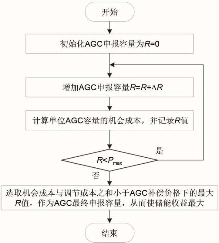 值得注意的是,如果儲(chǔ)能系統(tǒng)的容量相對(duì)于整個(gè)電力系統(tǒng)來說很小,則其對(duì)電能量市場(chǎng)出清電價(jià)的影響可以忽略不計(jì)。本研究將逐次計(jì)算鋰電池儲(chǔ)能提供不同AGC調(diào)頻容量下的機(jī)會(huì)成本,然后根據(jù)AGC機(jī)會(huì)成本、AGC調(diào)節(jié)成本之和與AGC補(bǔ)償價(jià)格的大小,做出參與電能量市場(chǎng)和輔助服務(wù)市場(chǎng)的決策。只要單位AGC容量的機(jī)會(huì)成本與AGC調(diào)節(jié)成本之和小于AGC補(bǔ)償價(jià)格,儲(chǔ)能系統(tǒng)就可以通過參與AGC市場(chǎng)獲得更多收益。因此,選取機(jī)會(huì)成本小于AGC補(bǔ)償價(jià)格下的最大AGC可申報(bào)容量,作為最優(yōu)決策,該市場(chǎng)策略的流程如圖1所示。