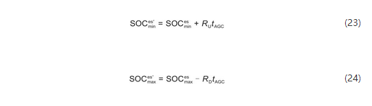 鋰電池儲(chǔ)能系統(tǒng)可以同時(shí)參與電能量市場(chǎng)和輔助服務(wù)市場(chǎng),需要預(yù)留出一部分容量,以備AGC的調(diào)用,而儲(chǔ)能一般有荷電狀態(tài)上、下限的約束,所以儲(chǔ)能除了要預(yù)留功率容量外,還需預(yù)留電量裕度,即荷電狀態(tài)的上、下限: