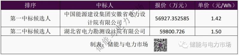 中國能源建設集團安徽省電力設計院有限公司以56927.35萬元,折合單價元/Wh的報價成為第一中標候選人,湖北省電力勘測設計院有限公司以59800.73萬元,折合單價元/Wh的報價成為第二中標候選人。