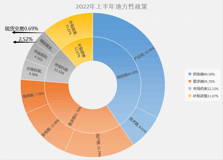 2022年上半年,共發(fā)布國家性政策52項(xiàng),供給側(cè)相關(guān)政策共23項(xiàng),其中產(chǎn)業(yè)側(cè)相關(guān)政策占比居多,共17個(gè),鼓勵(lì)技術(shù)側(cè)發(fā)展的政策有6項(xiàng);需求側(cè)政策18項(xiàng),市場機(jī)制相關(guān)政策11項(xiàng)。