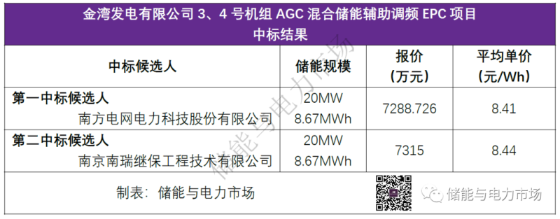 中國(guó)儲(chǔ)能網(wǎng)訊:近日金灣發(fā)電有限公司3、4號(hào)機(jī)組AGC混合儲(chǔ)能輔助調(diào)頻項(xiàng)目EPC中標(biāo)結(jié)果發(fā)布,南方電網(wǎng)電力科技股份有限公司以7288.726萬(wàn)元的總報(bào)價(jià)成為第一中標(biāo)候選人。