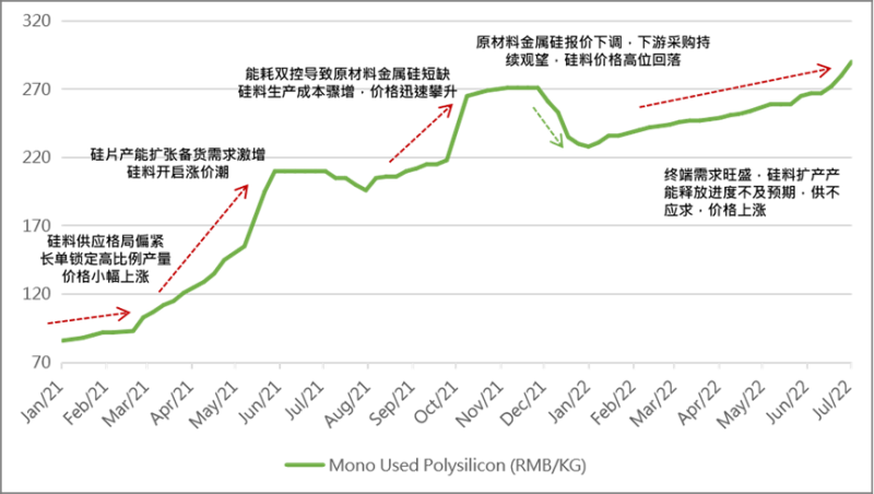 7月27日,中國(guó)有色金屬工業(yè)協(xié)會(huì)硅業(yè)分會(huì)公布了太陽能級(jí)多晶硅最新價(jià)格,其中,國(guó)內(nèi)單晶復(fù)投料價(jià)格區(qū)間在288-310元/kg,成交均價(jià)為297.6元/kg;單晶致密料價(jià)格區(qū)間在286-308元/kg,成交均價(jià)為295.5元/kg;單晶菜花料價(jià)格區(qū)間在283-306元/kg,成交均價(jià)為292.7元/kg。相較于2021年年初的8萬元/噸,漲幅接近4倍,再創(chuàng)新高。