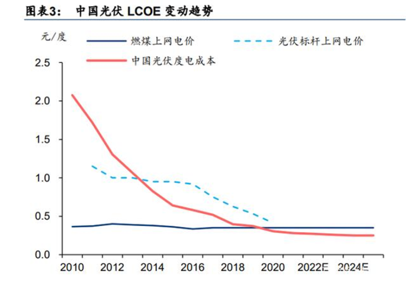 光伏行業(yè)最大的發(fā)展動(dòng)力是“平價(jià)”。從 2010 年的 0.381美元/kWh 到 2020 年的 0.057美元/kWh,光伏LCOE(平準(zhǔn)化度電成本)下降近 90%,是過去十年LCOE 下降最快的清潔能源。也正是基于此,2021年,光伏行業(yè)補(bǔ)貼順利退出,進(jìn)入全面平價(jià)時(shí)代。