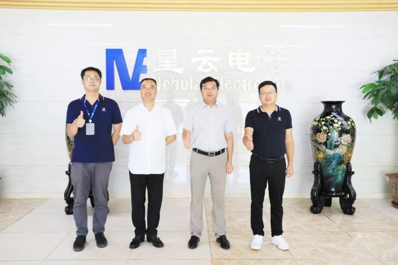 星云股份董事長李有財(cái)(左一)向南平市人民政府副市長何明星(左二)一行介紹公司的產(chǎn)品和技術(shù)