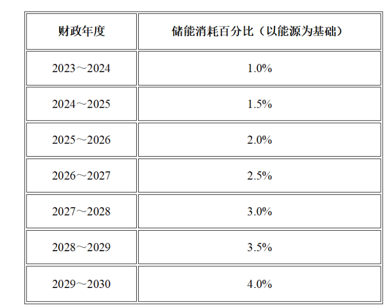 而儲(chǔ)能義務(wù)(ESO)規(guī)定,在2023年~2024年期間,太陽(yáng)能發(fā)電設(shè)施或風(fēng)力發(fā)電設(shè)施或通過(guò)儲(chǔ)能系統(tǒng)消耗的總能源比例應(yīng)設(shè)定為1%。并在2030年逐步上升至4%,如下表所示。