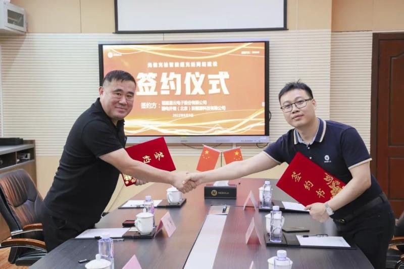 星云股份董事兼總裁劉作斌(右)與國電許繼(北京)新能源科技有限公司總經(jīng)理楊光代表雙方進行合作簽約