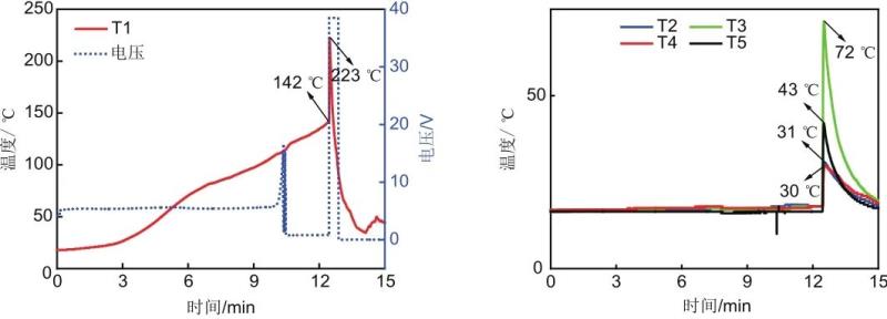在室溫條件下,以27 A(2 C)電流對(duì)單體電池進(jìn)行恒流過充,最高電壓上限設(shè)置為10倍額定電壓(37 V)。當(dāng)電池達(dá)到充電限制電壓時(shí),改為恒壓充電,直到電池發(fā)生爆炸或燃燒。